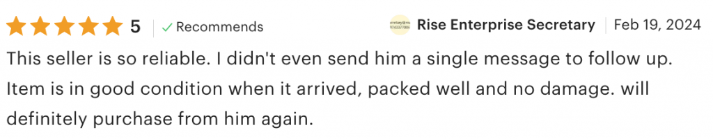 “This seller is so reliable. I didn’t even send him a single message to follow up. Item is in good condition when it arrived, packed well and no damage. will definitely purchase from him again.”