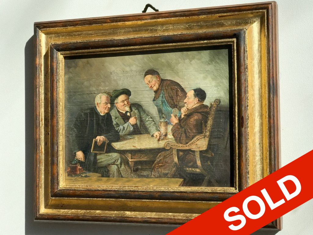 Antique oil painting, card players having fun, with gilded frame, oil on wood